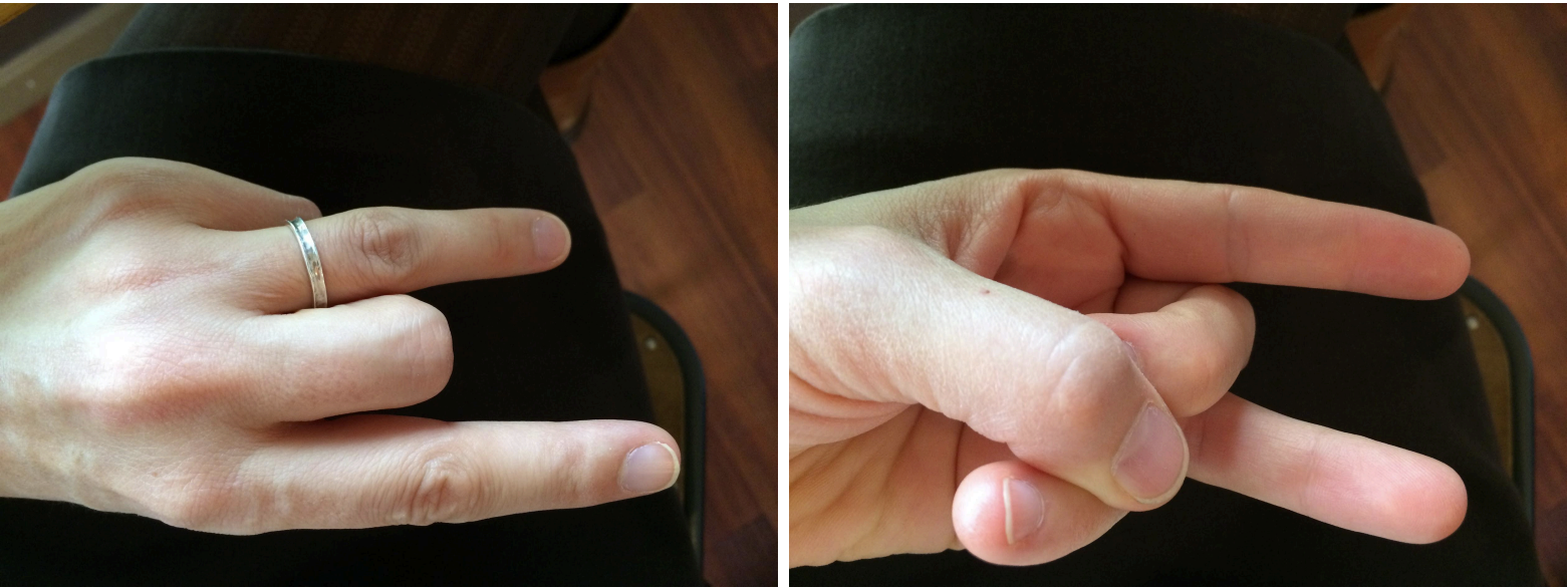Step 2: Create the following hand gesture (mudra) on both hands: Use your thumb to hold down your pinky and middle fingers, leaving the ring and index fingers extended (see below).
